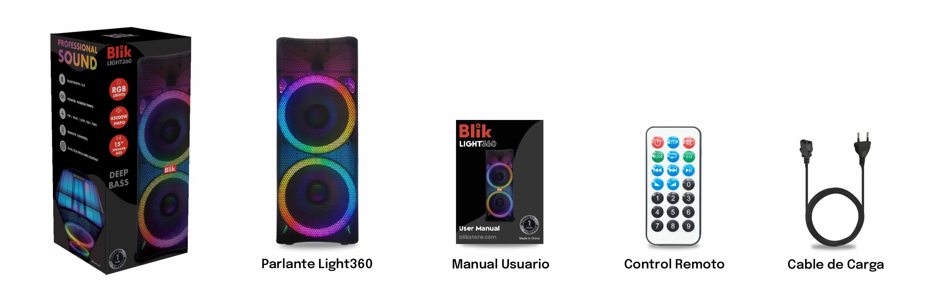 El Blik Light360 combina potencia y espectáculo visual. Con 45000W PMPO y su parlante de 15”, este imponente equipo ofrece un sonido intenso y profesional, mientras sus luces RGB 360 iluminan cada rincón, creando una atmósfera vibrante y llena de energía. Controla todo con facilidad gracias a su control remoto y múltiples entradas. ¡El sonido nunca se vio ni sintió tan bien!